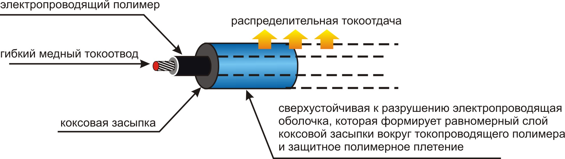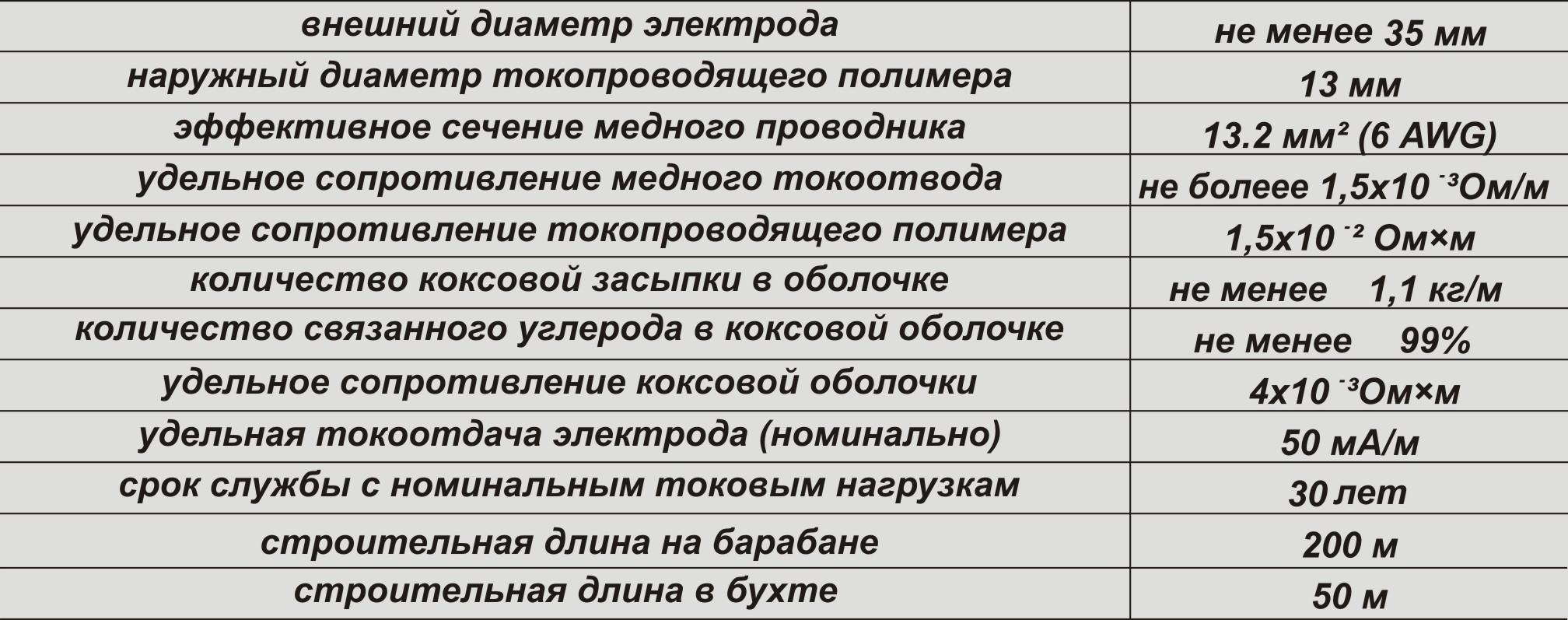 Электроды анодного заземления типа ПВЕК гибкий протяжный монолитный цилиндр, состоящий из электропроводящего полимера и коксовой оболочки, завулканизованного коаксиально вдоль его центральной оси металлическим токопроводом.